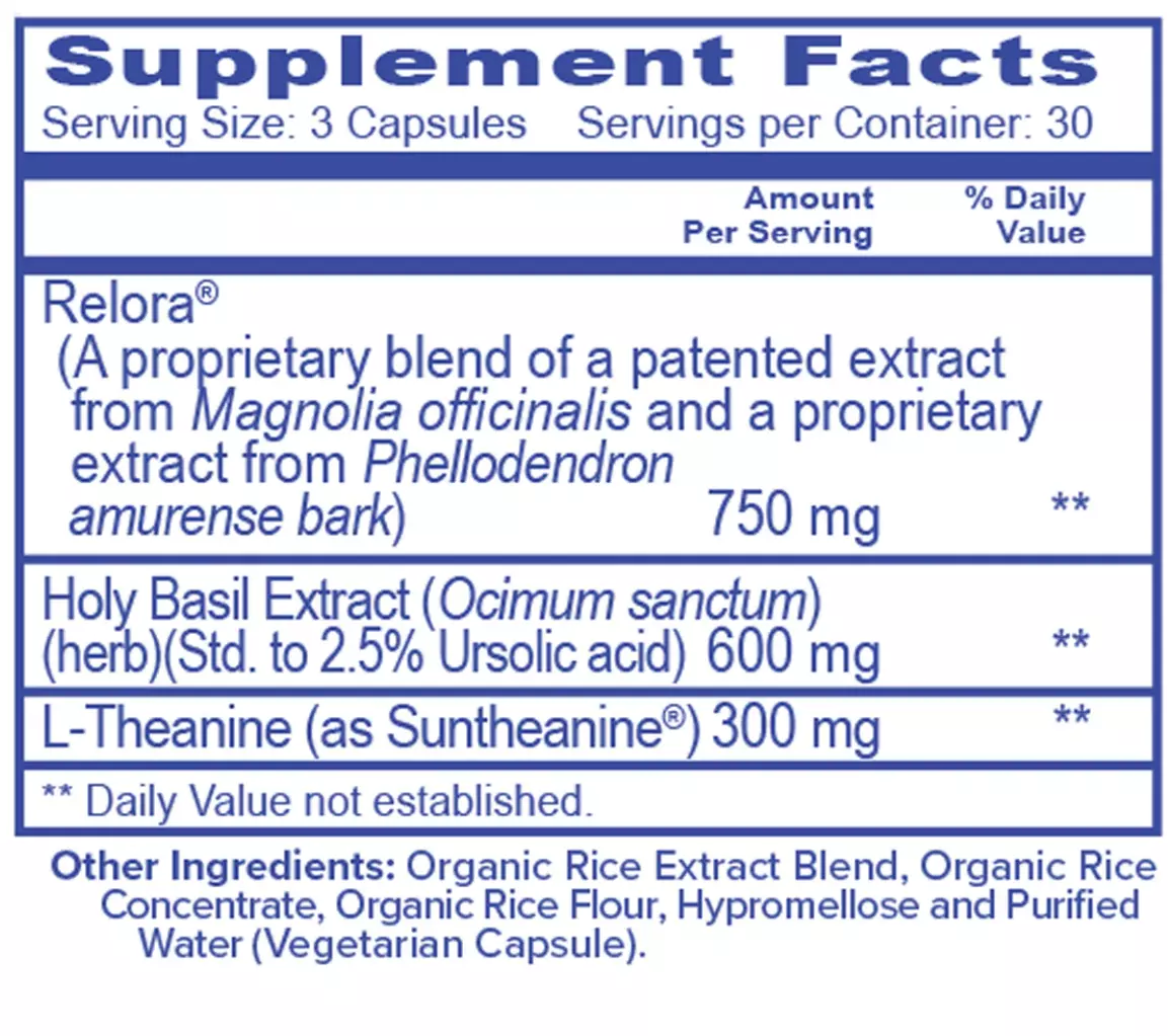 QuiCalm is an advanced nutraceutical and botanical formulation designed to reduce the feeling of stress and anxiousness as well as reduce stress related food cravings. Ingredients in QuiCalm have been shown to reduce stress related weight gain. Reducing stress is important in minimizing excess sympathetic tone and loss of heart rate variability which can lead to blood pressure changes. QuiCalm contains Relora (proprietary extract containing Magnolia officinalis and Phellodendron amurense barks), holy basil (Ocimum sanctum) leaf extract (std. 2% ursolic acid) and L-theanine (Suntheanine®). Supports TRIAD 1 stress issues and TRIAD 2 brain/anxiety issues. By Metabolic Code.